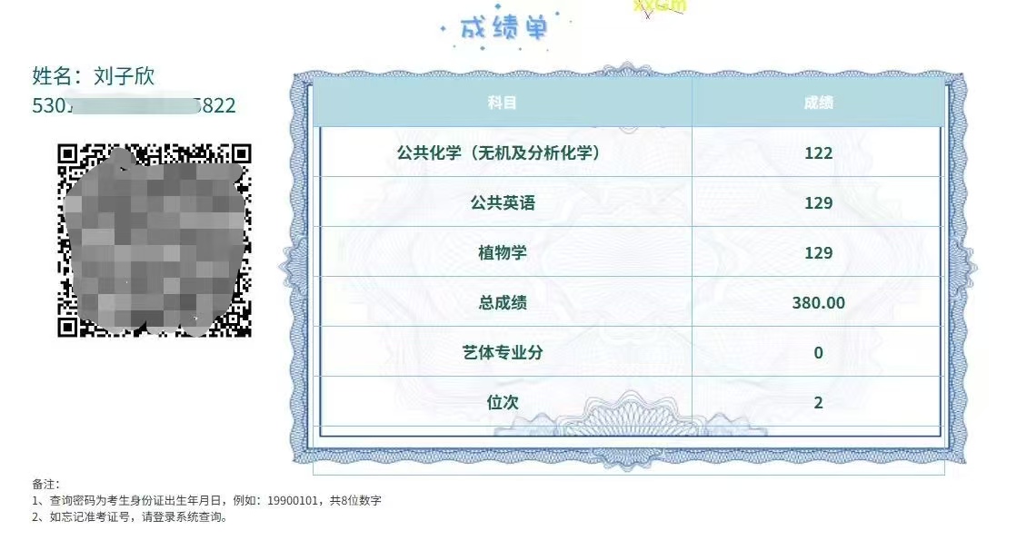 热烈祝贺农学与园艺技术学院23园艺技术一班刘子欣同学,在已取得专升本免试的资格下,在升学考试中又大放异彩,勇夺佳绩!公共化学 122 分、公共英语 129 分、植物学 129 分,以总分 380 分的优异成绩位列专业第 2 名!